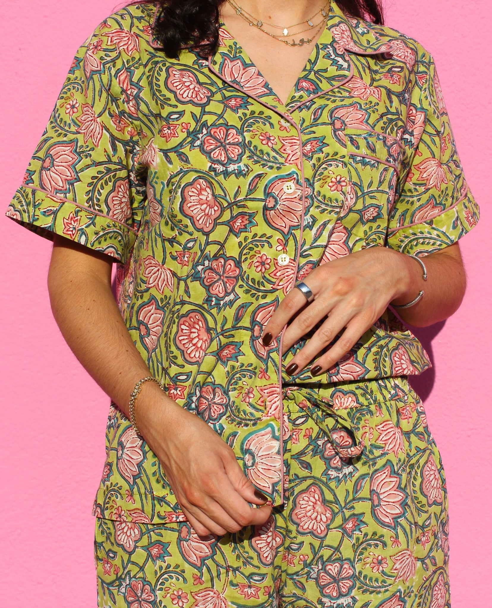 Lightweight and airy cotton, designed to float you closer to your dreams. A short-sleeve button-down top with straight-leg pants, detailed in baby pink red piping.