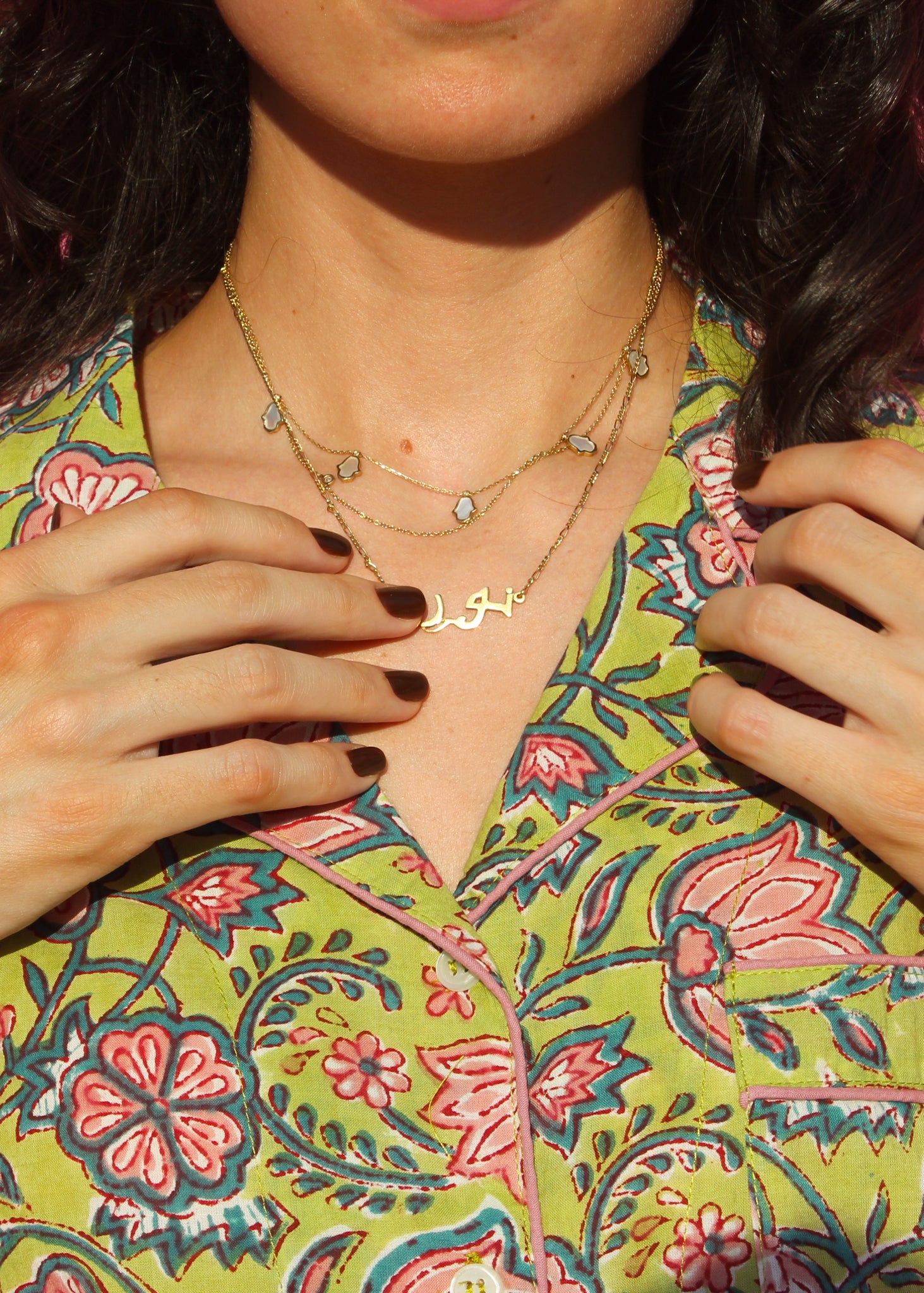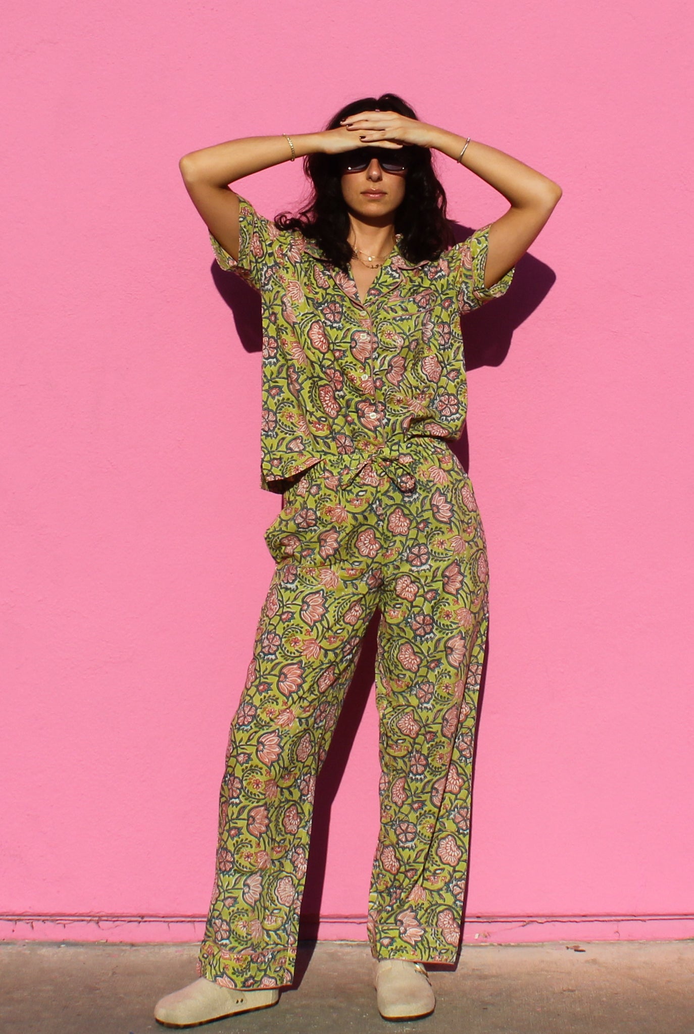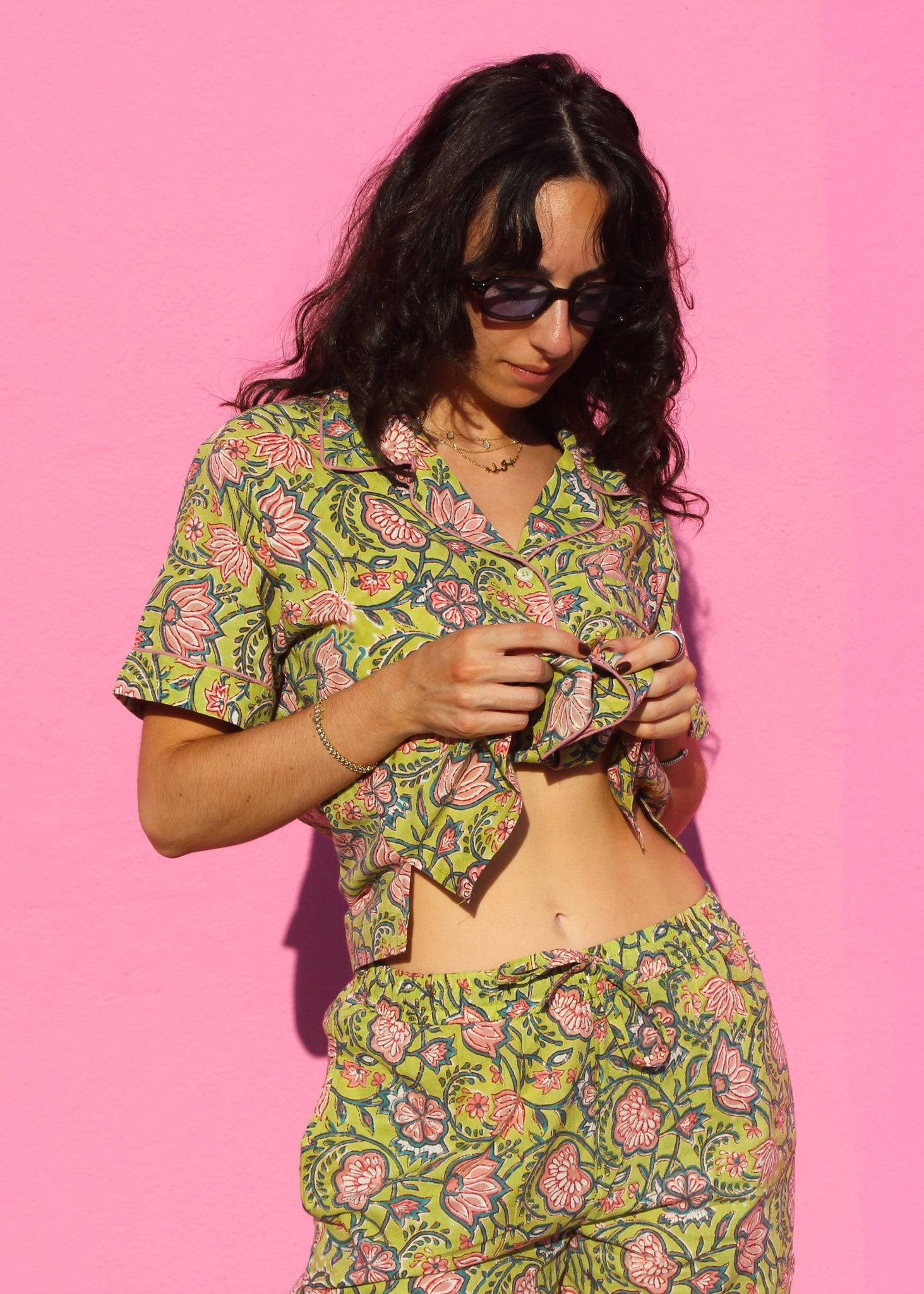 Because our pieces are 100% cotton, expect a little natural shrinkage after washing. If you’re between sizes, sizing up will keep the fit easy and comfortable. Mari and Noor are both is 5’6” and wear S or M. Yumna is 5'5" and wears L for pants.